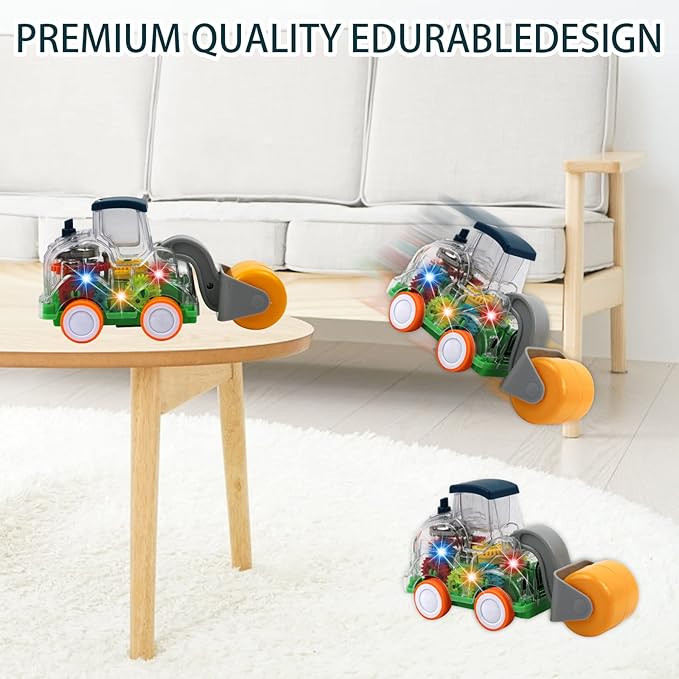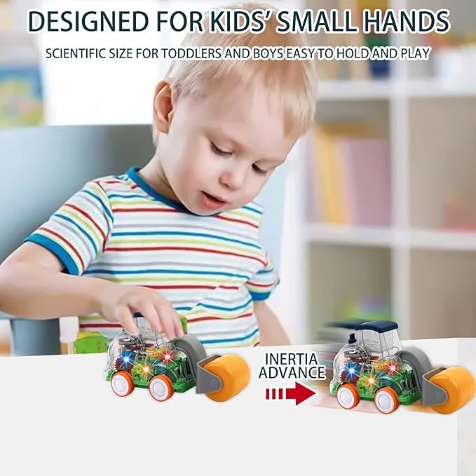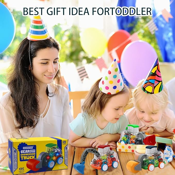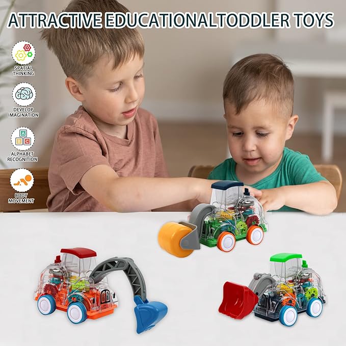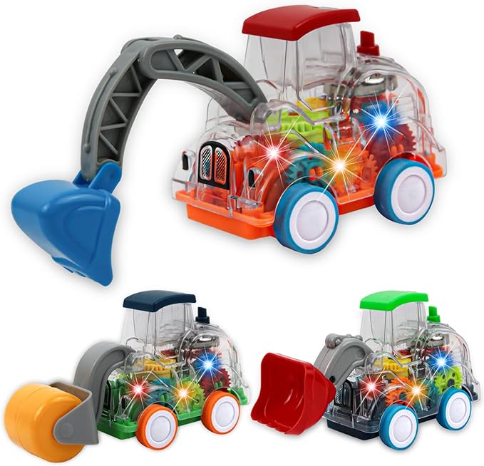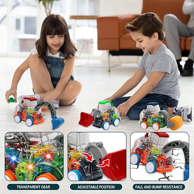• Unique Design: A great vehicle set, turn on the switch at the bottom of the vehicle to start a light show, the transparent body allows children to observe the working state of the gear drive, keeping children entertained for hours, it is not only a children's truck toy, but also the best construction-themed birthday gift.