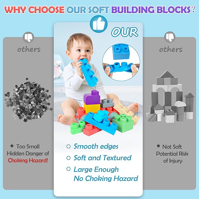 • Soft & Comfortable: Our soft building block set is made with a comfortable and pliable material that makes it easy for babies to grip and bite, especially during teething. The rounded edges of toddler big building blocks are flexible and safe, preventing injuries even if stepped on. Additionally, the soft material enhances babies' exploration and curiosity, making them more willing to interact with the toy set.